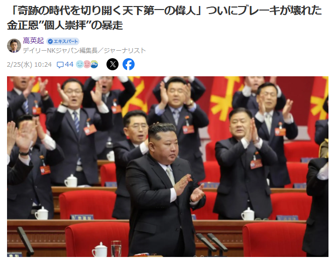 >高英起先生『「奇跡の時代を切り開く天下第一の偉人」ついにブレーキが壊れた金正恩”個人崇拝”の暴走』https://news.yahoo.co.jp/expert/articles/e035cf2177d5f66b7187692d21dffa09f02a8917 労働新聞が金総書記を「奇跡の時代を切り開く天下第一の偉人... -