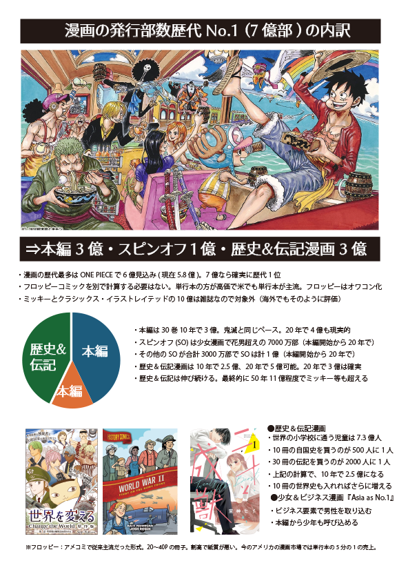 漫画の発行部数歴代1位(7億部)の内訳のページが大雑把にできました。 ・本編:3億・スピンオフ:1億(うち少女漫画7000万)・歴史&伝記漫画:3億 上記を20年で達成、というイメージです。(本編は金総書記と朝鮮の躍進によって、20年で4億行く可能性が... -