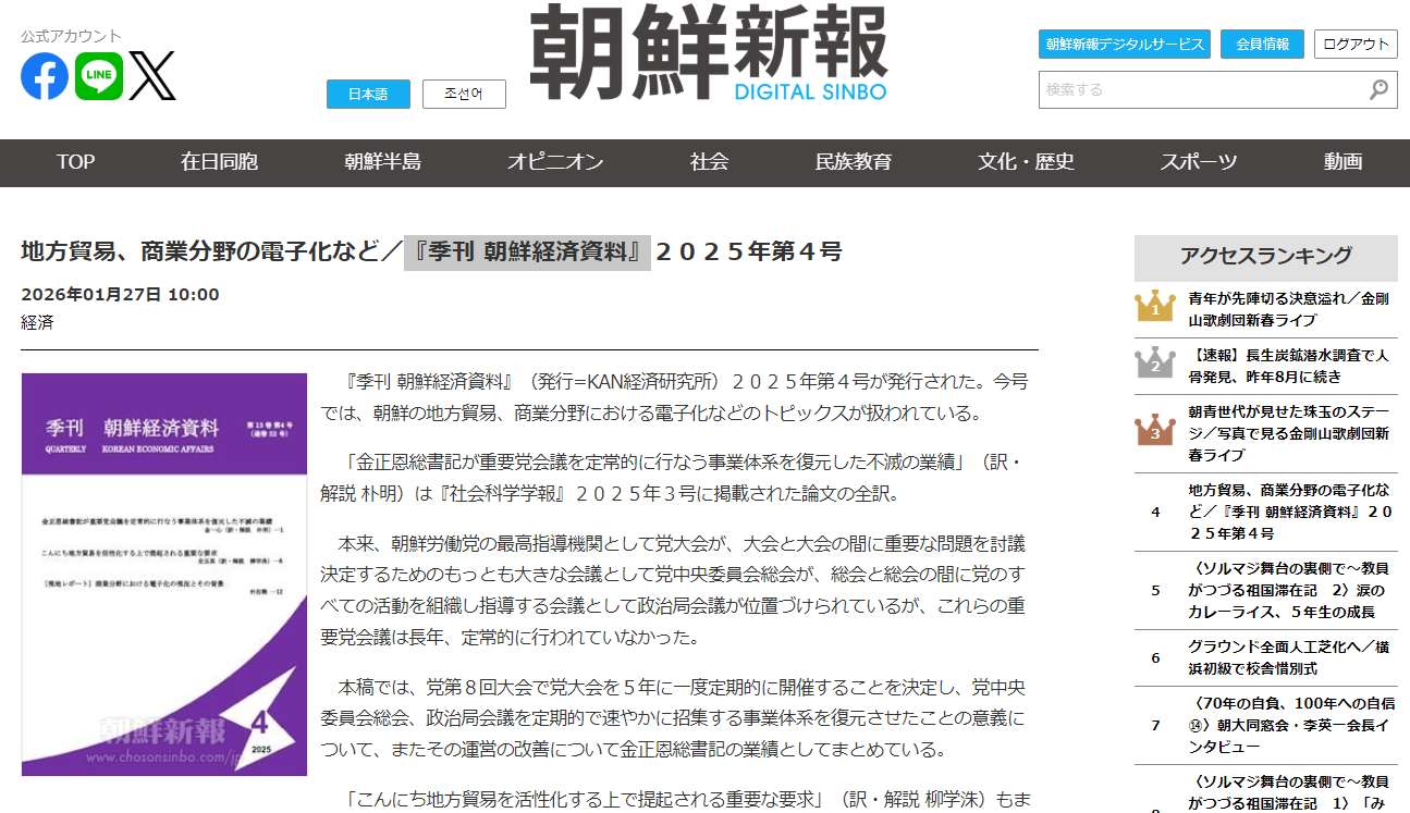 地方貿易、商業分野の電子化など/『季刊 朝鮮経済資料』2025年第4号 『季刊 朝鮮経済資料』(発行=KAN経済研究所)2025年第4号が発行された。今号では、朝鮮の地方貿易、商業分野における電子化などのトピックスが扱われている。 「金正...