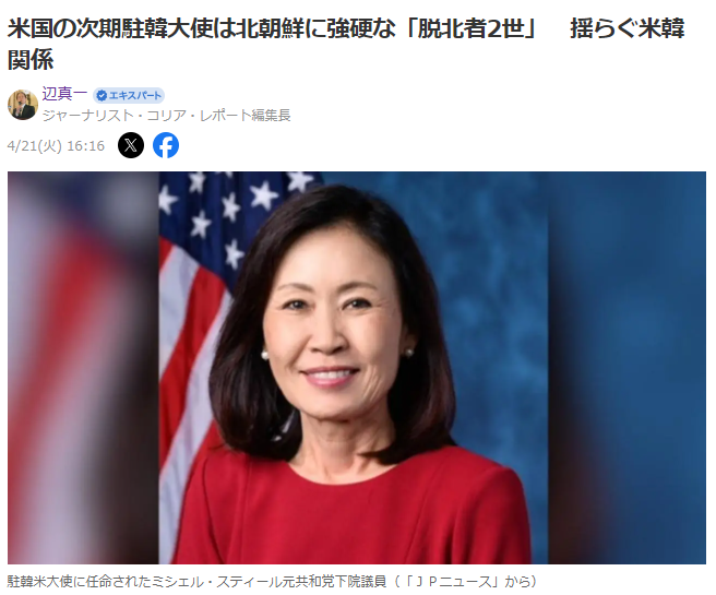 辺真一先生による記事で、ミシェル・スティール元共和党下院議員が、米国の次期駐韓大使に選ばれた理由や影響について、わかりやすくまとめられています。