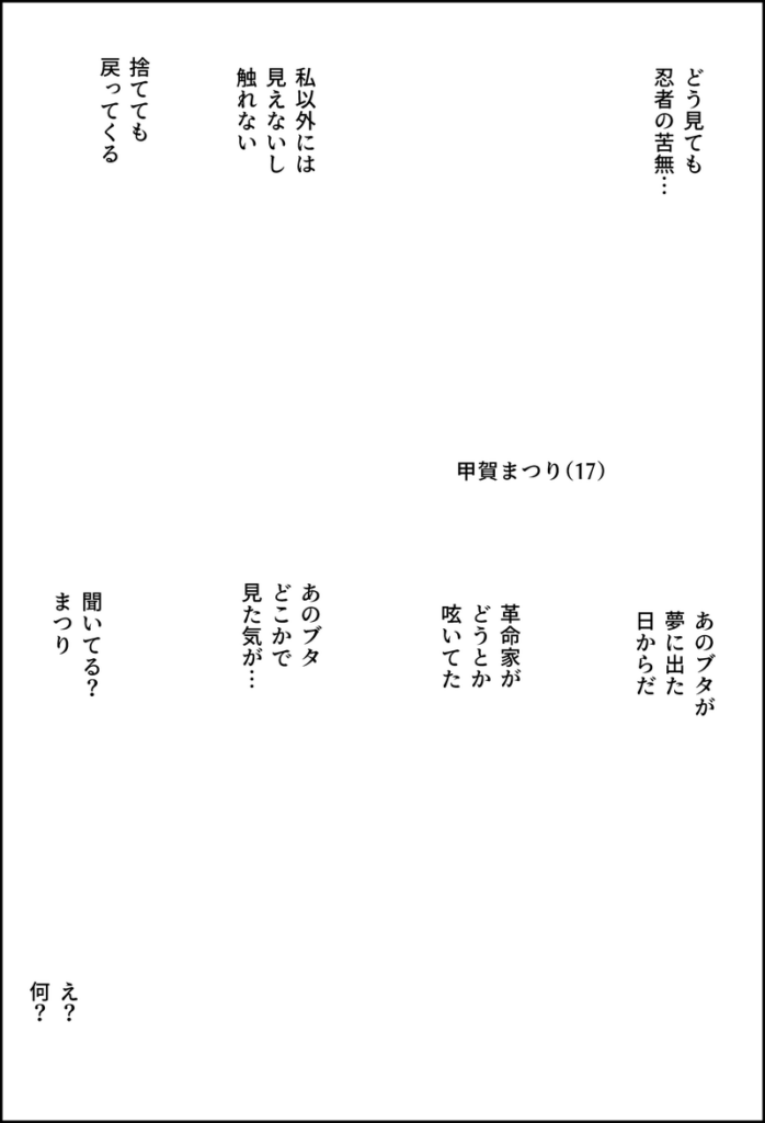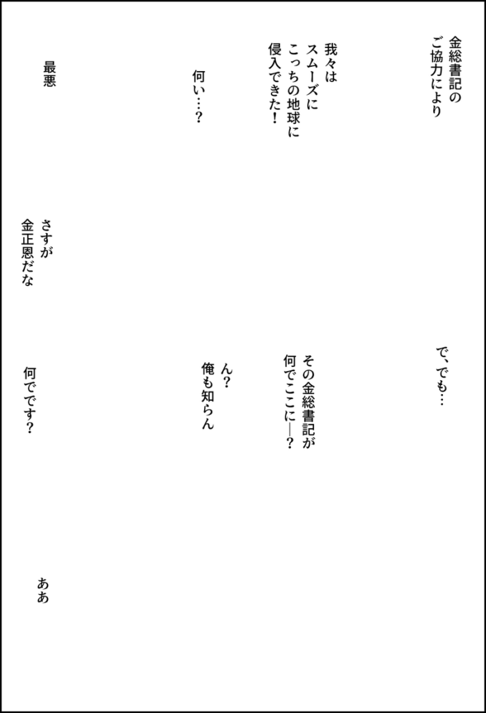主人公(甲賀まつり)と正恩の会話が多いので、会話を減らすのも課題です。