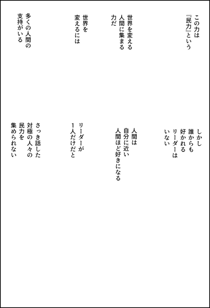 リーダーが1人だけだとさっき話した対極の人々のミンリキを集められない